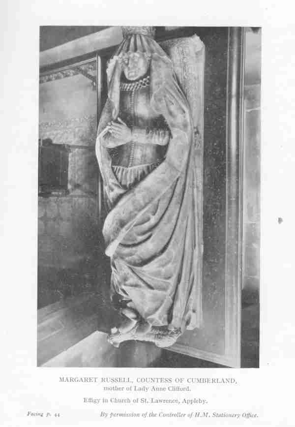 Here were all the makings of a first-class row. Continual lawsuits were waged by the mother on behalf of the daughter. In 1607 they were both denied entrance to Skipton. So it went on until 1616 when the dowager countess died at Brougham Castle in Westmorland, leaving the great lawsuit still unsettled. Her daughter was present at her burial which took place in Appleby Church where her monument may still be seen. The Countess Margaret seems to have been an affectionate mother. Her daughter Anne describes her as a "woman of great natural with and judgment, of a sweet disposition truly religious and virtuous, and endowed with a large share of those four moral virtues - prudence, justice, fortitude and temperance."