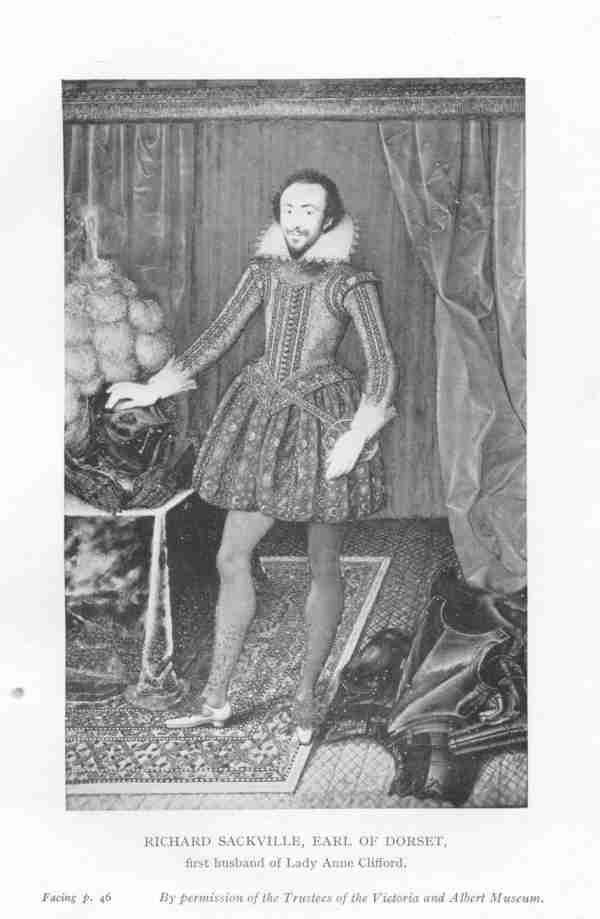In the meantime, while the legal disputes were dragging on, Anne had married and started her family. She married in 1609 at the age of nineteen. It was not a happy marriage and little love was lost between them. He was gay and she was serious; moreover the quarrel over her inheritance, in which, as we have seen, he sided against her, was a constant cause of friction and trouble. Dorset had the appearance of what used to be called a spark. I have already mentioned his miniature, painted by Oliver, in the Victoria and Albert Museum. The catalogue of that exhibition quotes a contemporary description of Dorset as "a man of spirit and talent, but a licentious spendthrift." In an illustrated article about this exhibition written by Denys Sutton in Country Life,7 there is a reproduction of this particular miniature as to which the writer says with point that the "portrait of Richard Sackville, 3rd Earl of Dorset, fits the contemporary description of him." Carl Winter refers to it in his "King Penguin" book as one of Oliver's largest and most imposing miniatures reflecting the fashionable style of oilpaintings of Marcus Gheeraets, the younger.